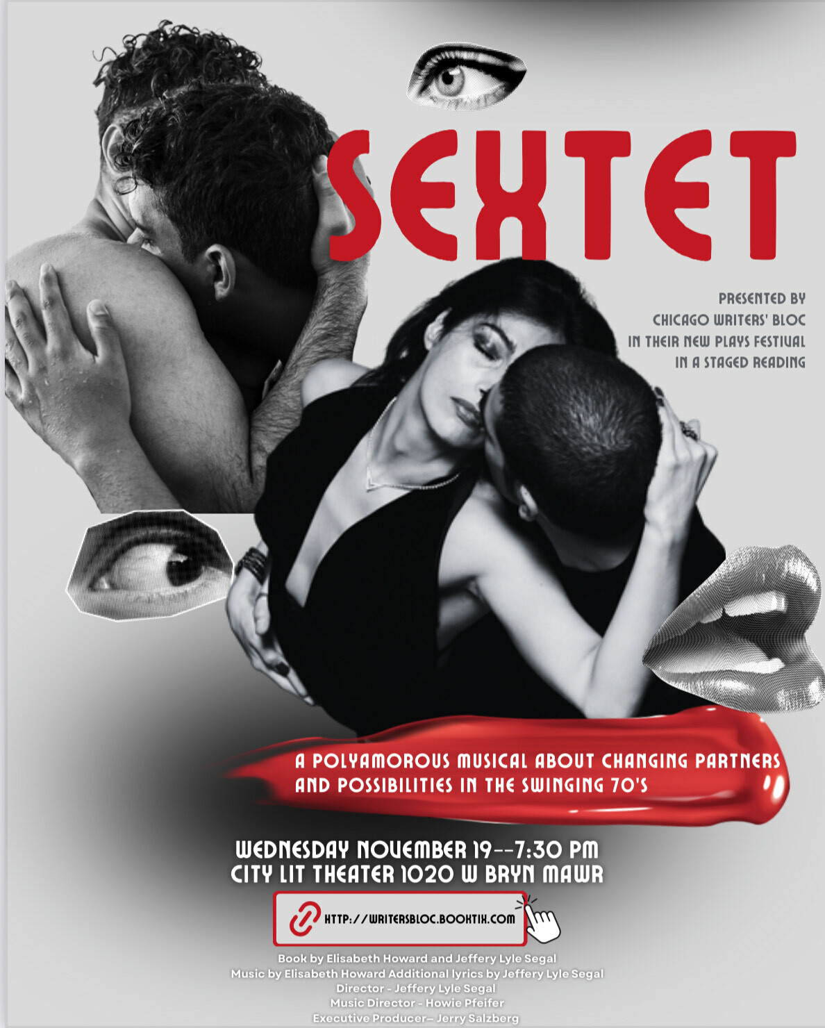 "SEXTET," a polyamorous musical, co-written by Elisabeth Howard, in the 70's in New York, will have a staged reading on Wednesday evening, November 19 at 7:30 at the City Lit Theater, located at 1020 W Bryn Mawr. Tickets are $25. https://writersbloc.booktix.com/ SEXTET will be presented by Chicago Writers' Bloc in their New Plays Festival. The new book is co authored by Elisabeth Howard and the amazingly talented Jeffery Lyle Segal, who will also be our Director. And.... Our Music Director, is the awesome Howie Pfeifer! Executive Producer - Jerry Salzberg.