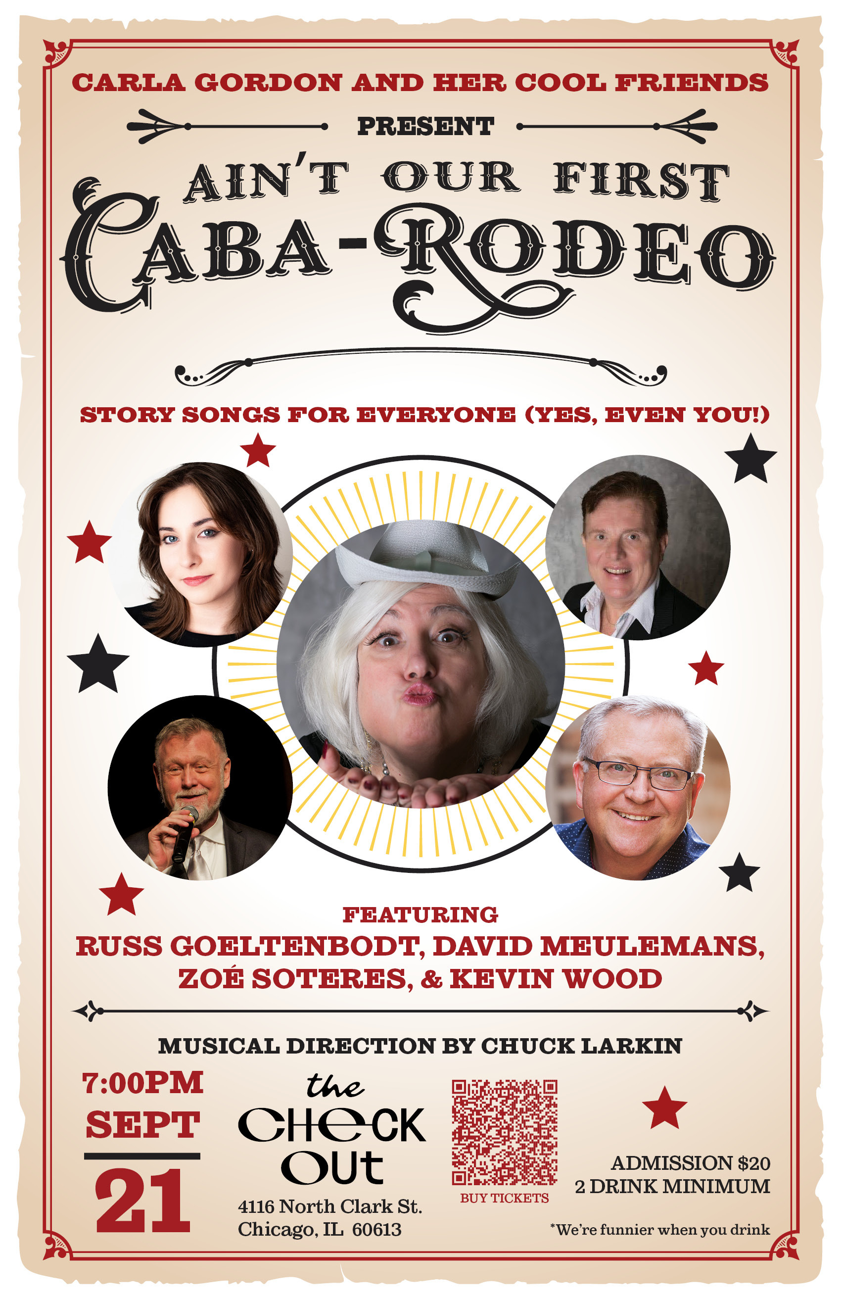 Multi-award winning cabaret singer-songwriter Carla Gordon is gathering her flock of singing canaries to entertain you in Ain't Our First Caba-Rodeo! Cabaret is about songs that tell a story. Our stories will make you laugh, some will make you think, and others will make you misty-eyed. With music direction by Chuck Larkin, our cast feature members of the Chicago Cabaret Professionals including Russ Goeltenbodt, David Meulemans, Zoe Soteres, and Kevin Wood. So, pull up a chair and get ready for a wonderful time!