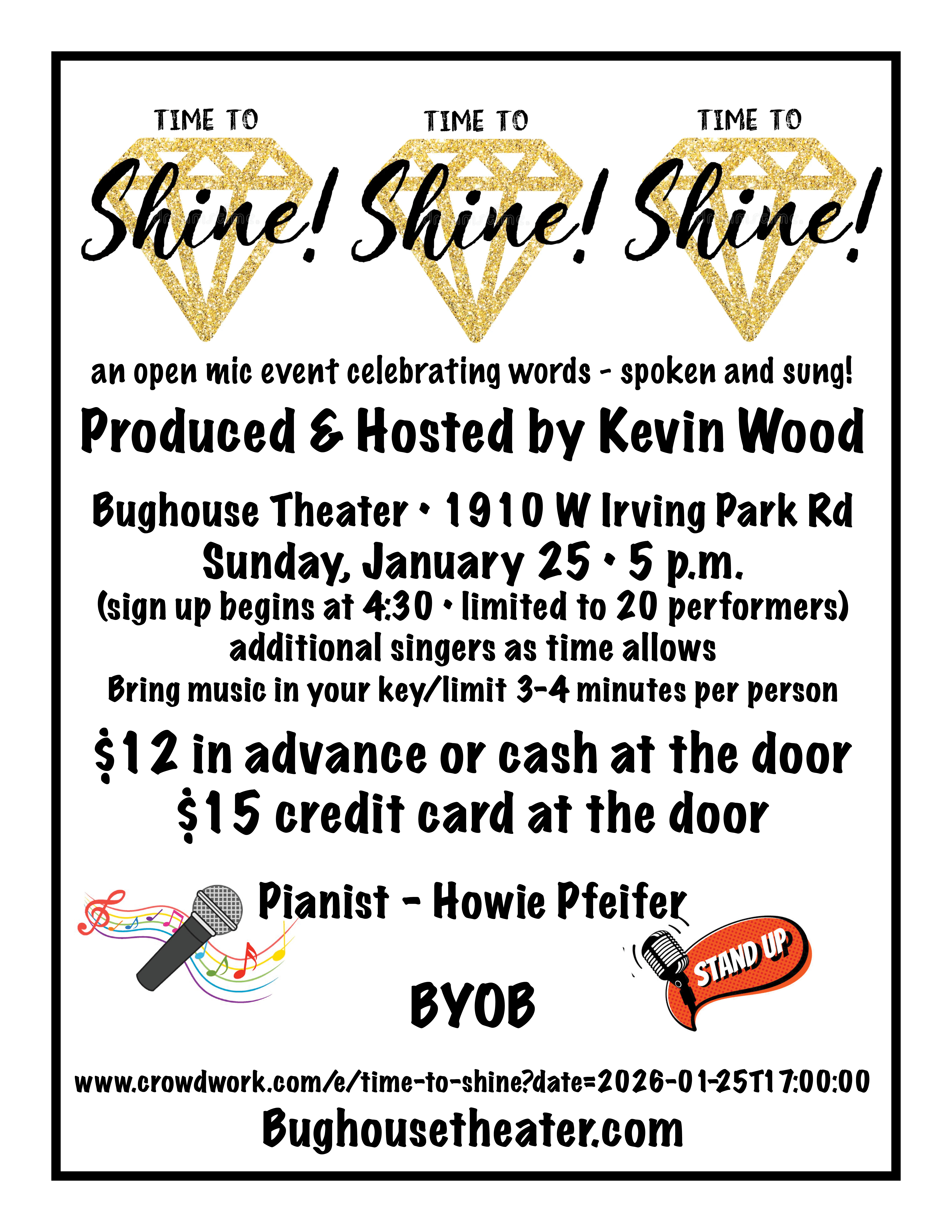 Please join us, as a singer or as an enthusiastic audience member, for our second open mic at Bughouse Theater. This intimate, 50 seat venue is a great space to try out new material or just be on stage for a few minutes. BYOB so if you'd like a soda, wine or something beverage, bring it (and a glass!) along with you. Sign up starts at 4:30 p.m. with 5:00 start time. Limited to 20 singers as there is an event following ours at the venue. Ample, free Sunday metered parking.
