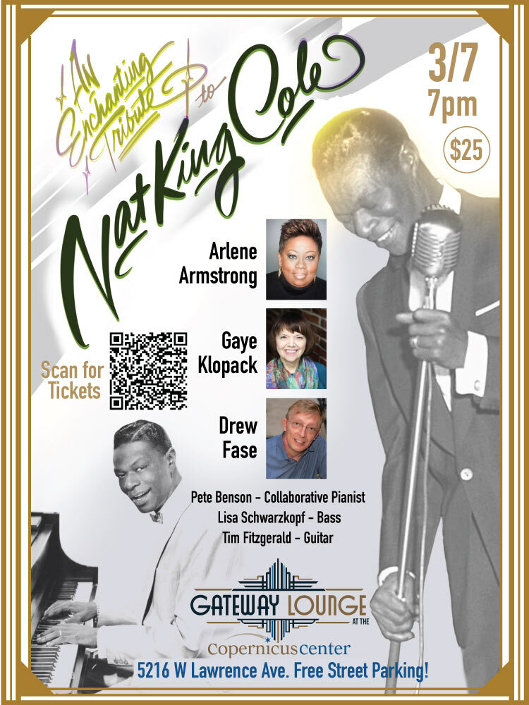 Join us for our Tribute to Nat King Cole on March 7 at the Gateway Lounge in the Copernicus Center. Singers Gaye Klopack, Arlene Armstrong and Drew Fase present some of Nat's well known and not so well known songs with a jazz ensemble with Pete Benson, piano, Tim Fitzgerald, guitar and Lisa Schwartzkopf, bass.