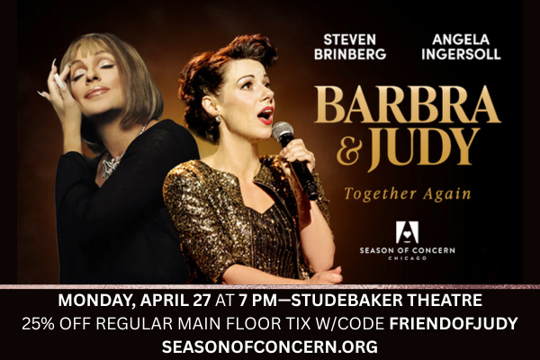 Season of Concern is offering Chicago Cabaret Professionals members a discount for their benefit concert next month: Barbra & Judy Together Again at the historic Studebaker Theater on Monday, April 27 at 7 PM. Use the code FRIENDOFJUDY to receive a 25% discount on regular main floor seats.
